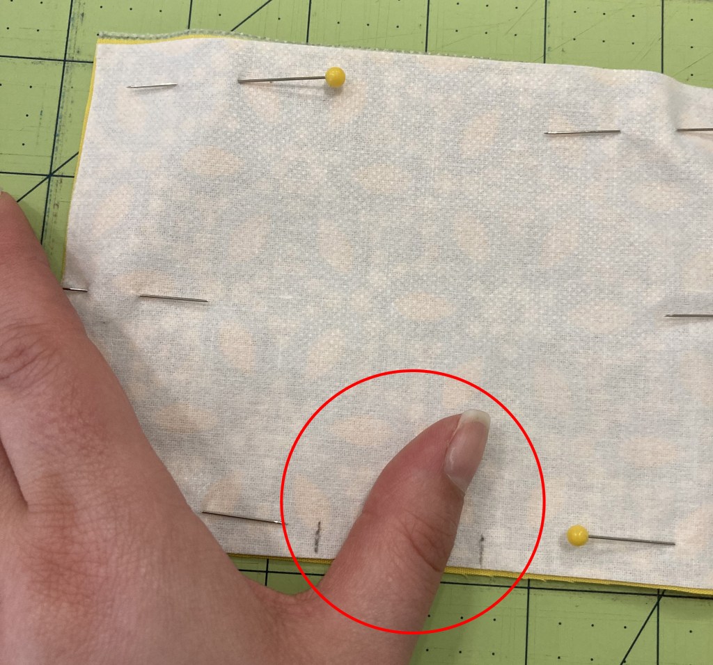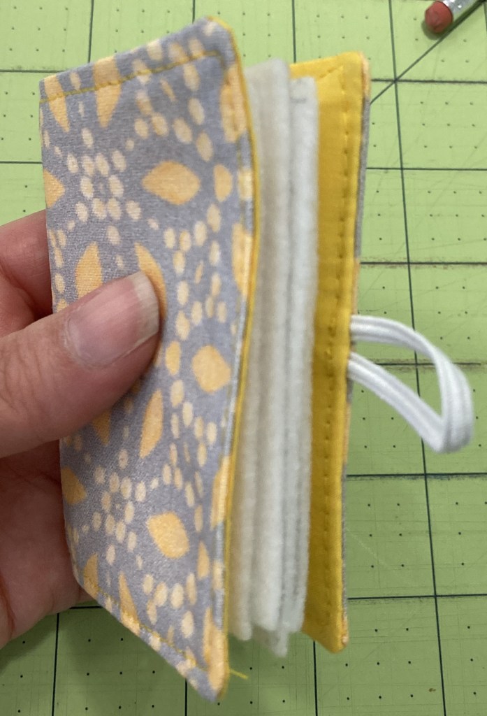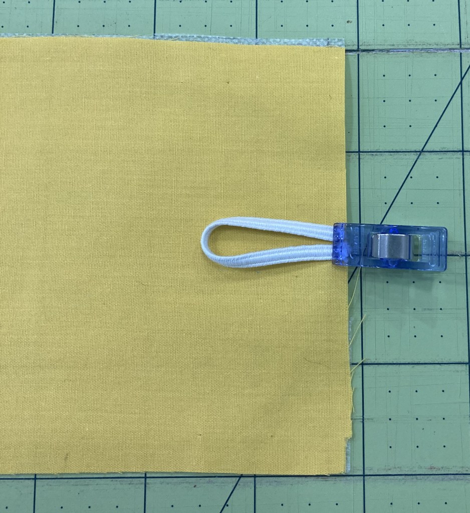Fold the elastic into a loop. Place it centered on the right (non-interfaced) side of the solid fabric, with the cut ends lined up with the edge, or hanging slightly over. Pin or clip (I find clips easier for this part) in place. Stitch & back stitch over the elastic about 1/8” from the edge of the fabric to tack it in place.