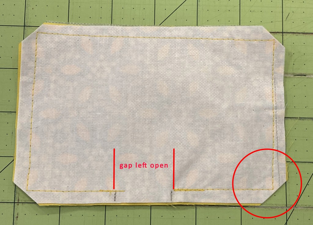Pin the patterned and solid rectangles right sides together. On one of the long edges, leave a space about 1-1 ¼” wide (big enough to get your thumb through). Starting on one side of the space, stitch around the rectangle with a ¼” seam allowance (on most domestic machines, the width of your presser foot). You will stitch over the elastic again. Don’t forget to backstitch beginning & end! Clip the corners at a 45* angle being careful not to cut through your stitching.