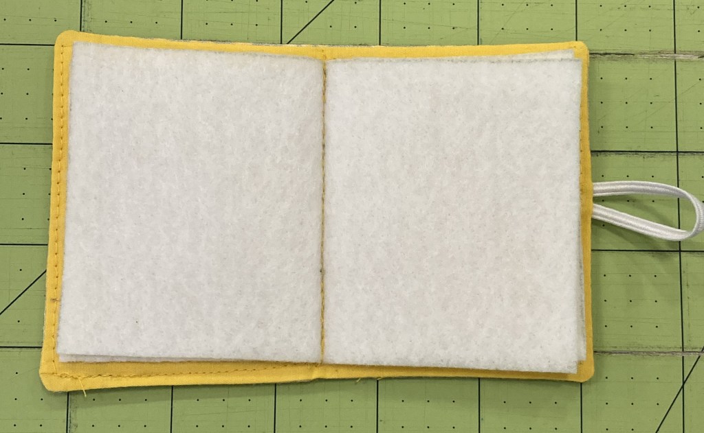 Using a pencil or disappearing ink marker, mark a center line on the solid fabric and both the felt pieces. Stack the felt pieces so that the center lines line up. Stack that stack on top of the cover, again lining up the center lines. Pin in place. Stich along the line from end to end of the cover, backstitching beginning & end.
