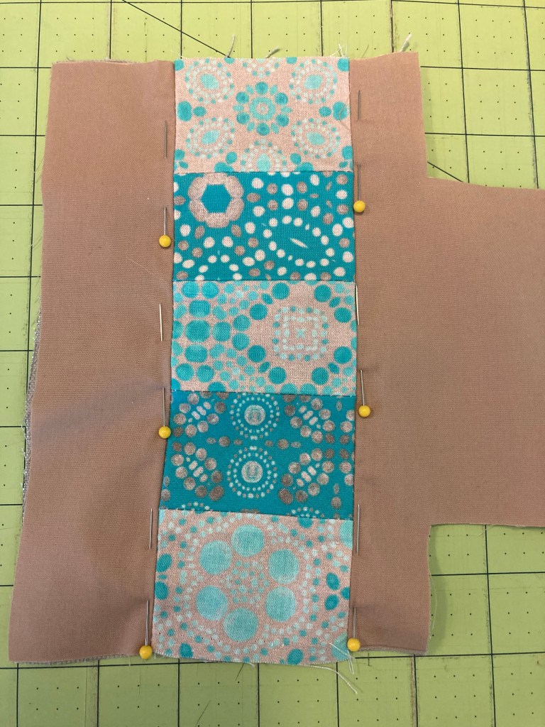 On the solid fabric, “quilt” through all layers by sewing straight lines parallel to the long edge of the stripe. Stitcher’s choice of how far apart to make them, but I think ¼” or one presser foot length apart looks nice. No need to back stitch, because the ends will get caught in the side seams.