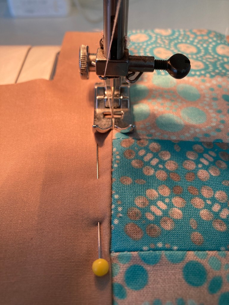 Fold the quilted piece right sides together, matching the side seams together. Stich the side seams from Point 1 to Point 2, backstitching beginning & end with a ¼” seam allowance. Press seams open.