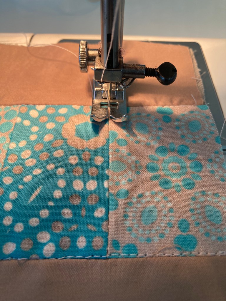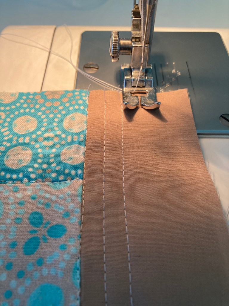Stitch in the ditch again through all layers along the seams between each section of the stripe (Template A). If you are doing a solid contrasting stripe, no need to stitch it further.
