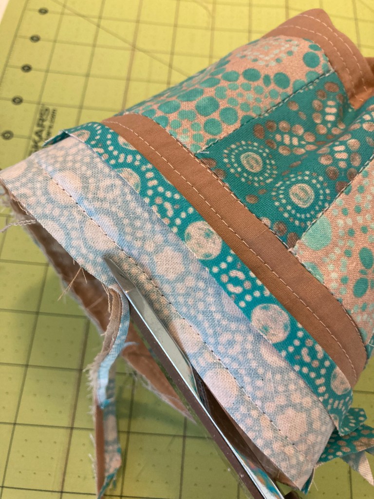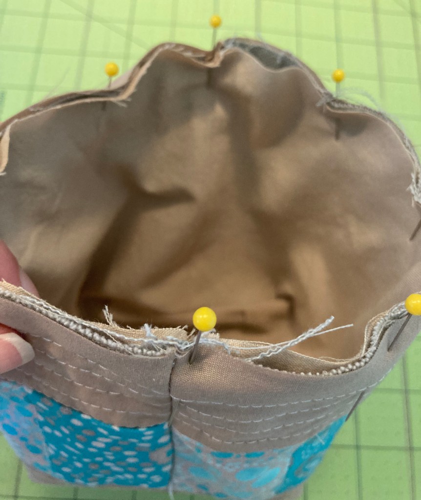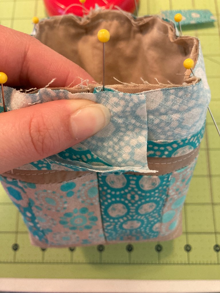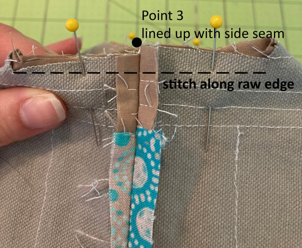 Pin one edge of your bias tape along the top edge of the bag, folding over the short end of the bias, and then overlapping that fold when you get back around to the beginning. This will create a nice, clean, continuous look. Stitch in the crease of the bias, backstitching beginning & end. Trim away about half (1/4”) of the seam allowance around the top edge through all layers.