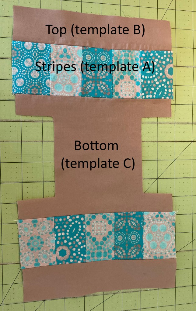 )If you are using one 3″x8″ strip of contrasting fabric instead of a stripe, jump to the next paragraph in this step.) Sew the stripes together. You will be making two strips of 5 sections each. Stitch the rectangle sections (Template A) together along the long side with a ¼” seam allowance. Press seams open.