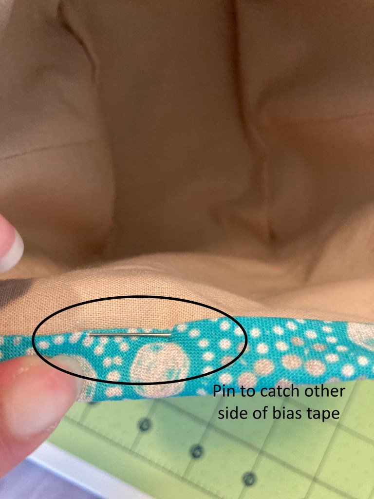 Fold the bias over the raw edge. The inside/back edge should land a little bit past the stitch line of the bias you just did. Pin in place through all layers. Stitch in the ditch through all layers, catching the back of the bias.