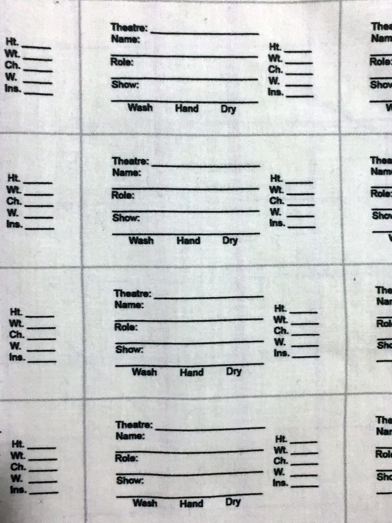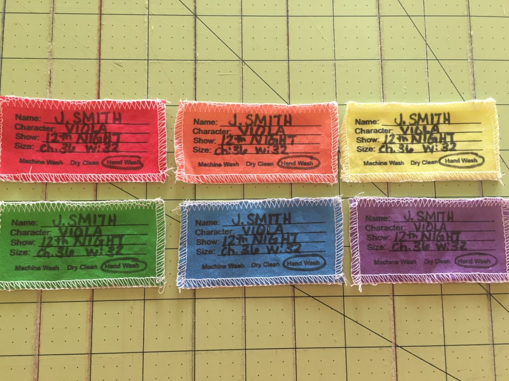 Developed while I was a freelance costume designer, these labels are perfect for organizing a show of any size! Write in all the important info–from performer name, character, care instructions, and more. Color options make color-coding for large or children’s productions a breeze! I recommend using Petal Signature Cotton with fusible interfacing on the back. Serge or pink the edges.
